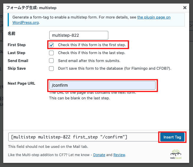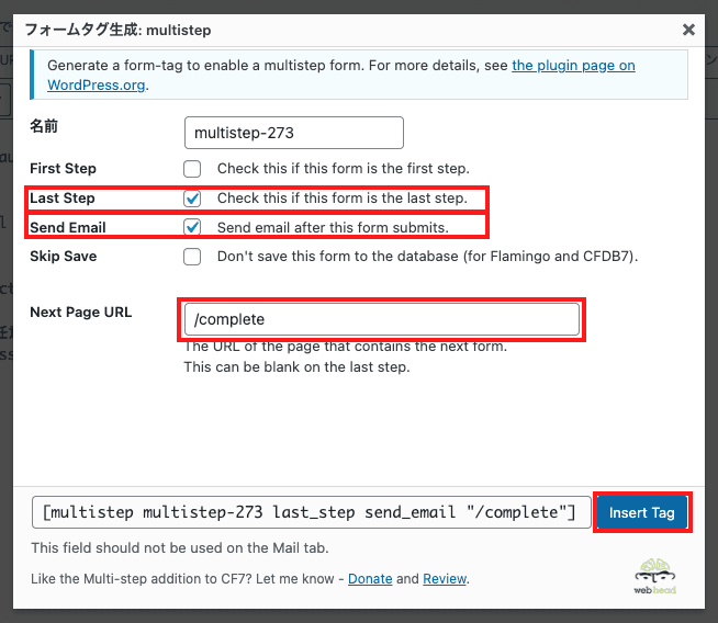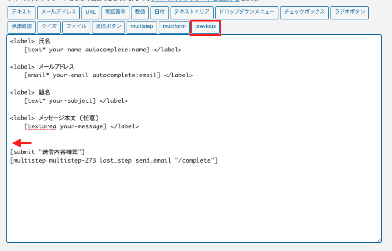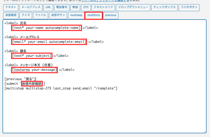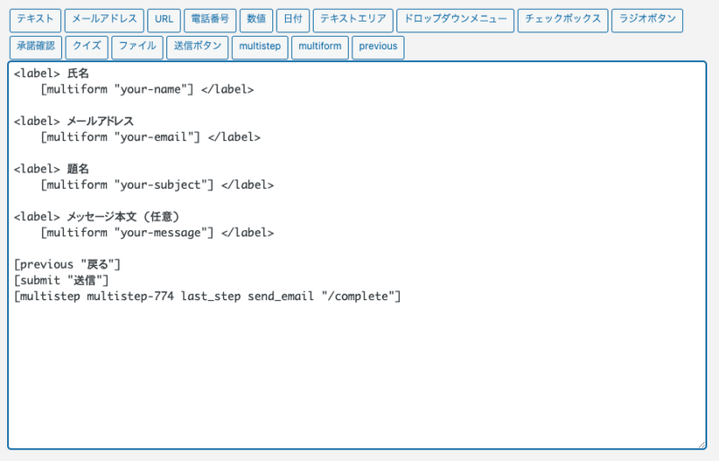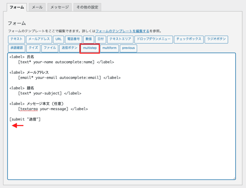 フォームの作成後、[submit "送信"]の下にカーソルを移動し、「multistep」をクリックします。